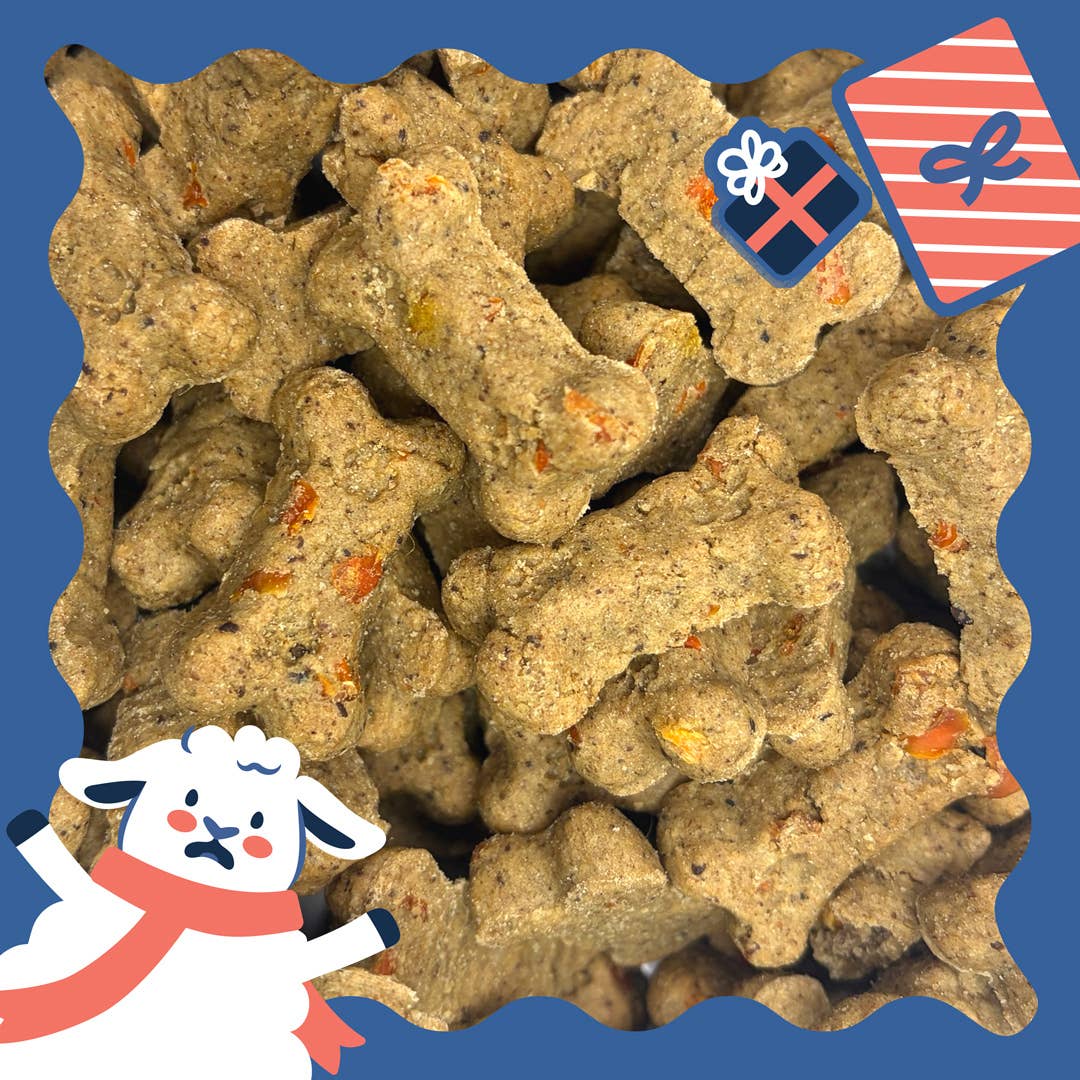 Ingredients: Dried bakery product, wheat flour, vegetable glycerin, lamb, canola oil, carrots, lactic acid, whole egg, natural peppermint flavor, mixed tocopherols